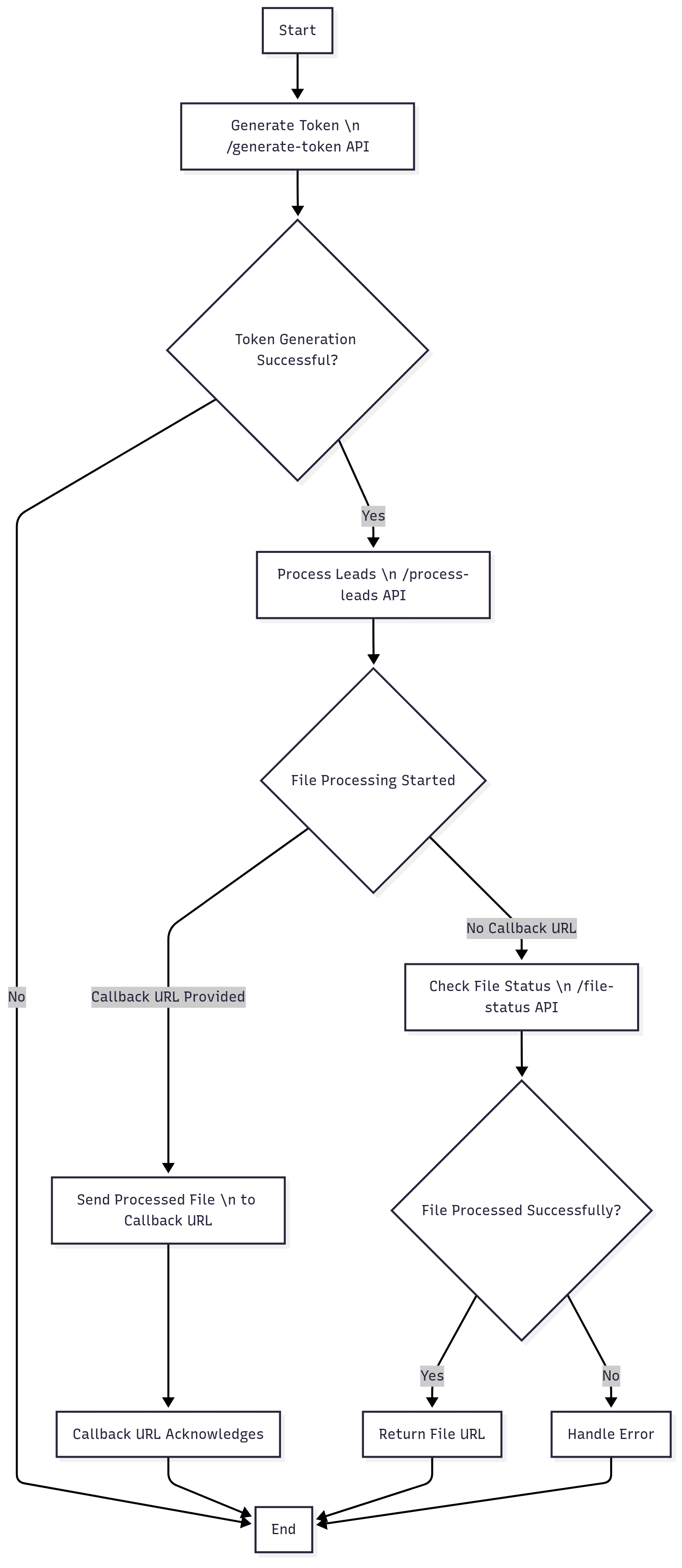 The /process-leads endpoint allows authorized users to submit lead data for processing, supporting both file-based and raw JSON input. This API is optimized for handling large datasets and can initiate lead scoring or enrichment workflows tailored to specific industries.